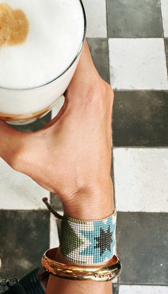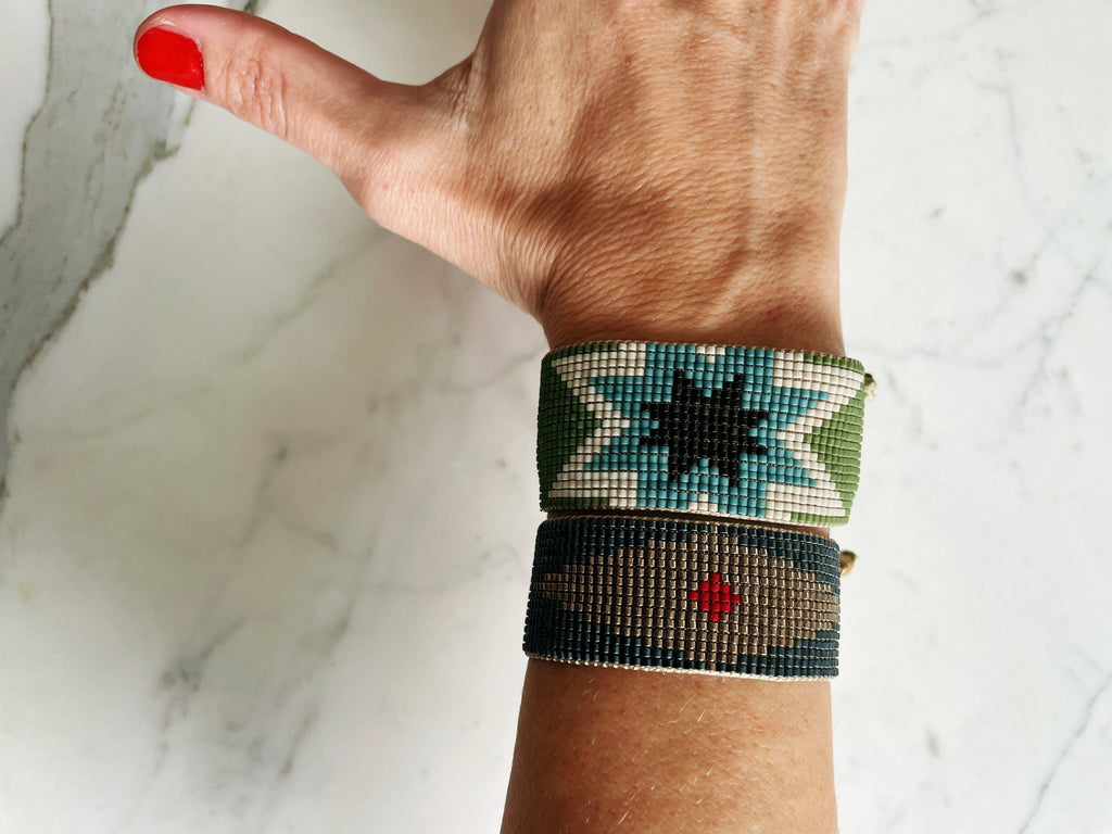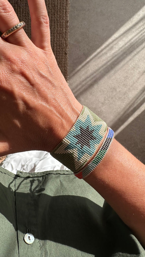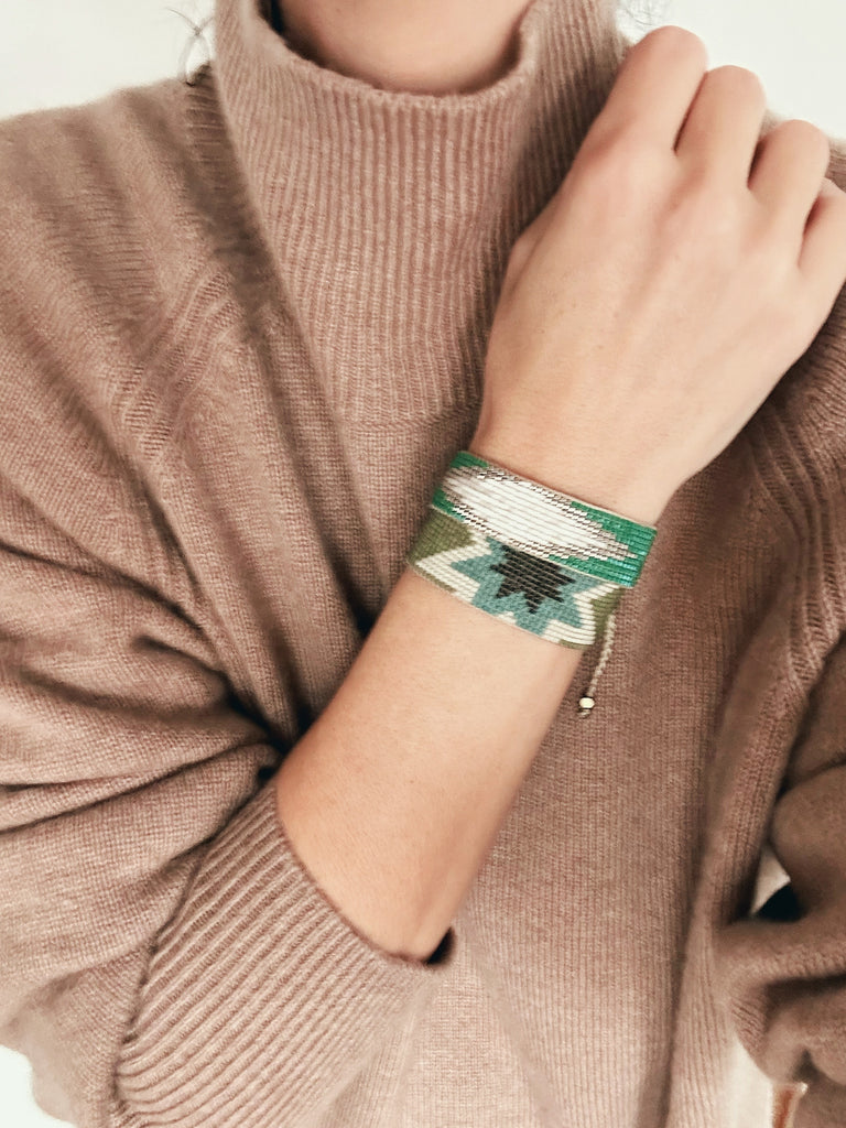 Handcrafted with an eye-catching combination of green, azure, and white Japanese beads, creating a boho-chic look that's perfect for any occasion.