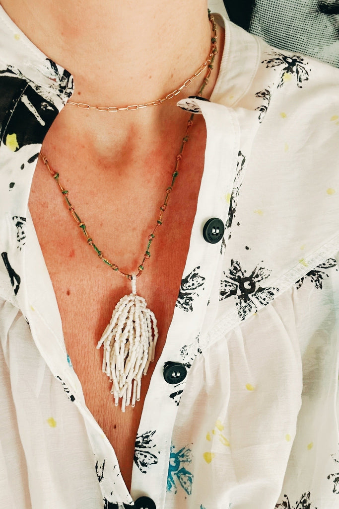 Say hey to Claire, your neck's new best friend. She's all about soft colors and light vibes, with a cord that's a dreamy mix of spring shades and a Japanese glass tassel that's pure ivory elegance. Perfectly sized to make a statement without saying a word, Claire's here to stay—but only if you snap her up quickly: There is only one piece!